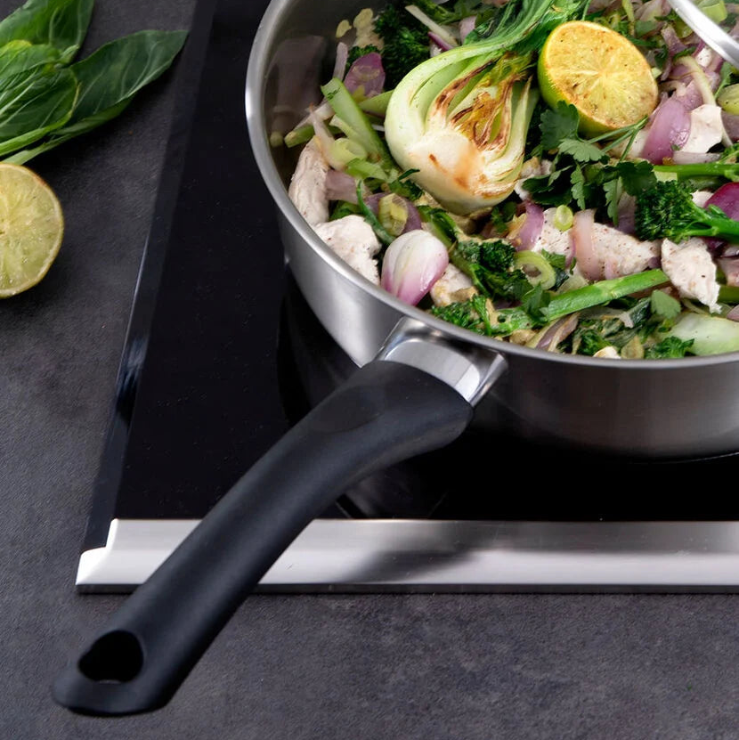 De roestvrijstalen koekenpannen van BK Bold hebben een krachtige uitstraling en zijn uiterst gebruiksvriendelijk. De items van de collectie hebben een gesatineerde afwerking aan de binnen- en buitenzijde. De stevige kunststof koudgreep helpt je om veilig en zorgeloos te kunnen bakken en braden. De BK Bold is perfect om gerechten snel dicht te schroeien en is geschikt voor alle warmtebronnen, inclusief inductie en de oven tot 160°C. Na gebruik kan de pan in de vaatwasser.