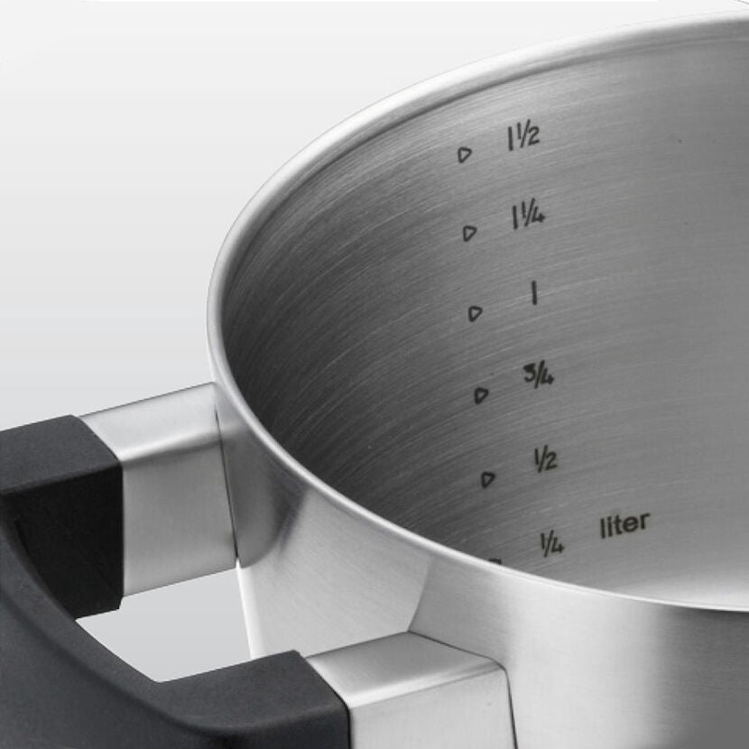 Een maatbeker is niet meer nodig dankzij de maatverdeling in de pannen.
