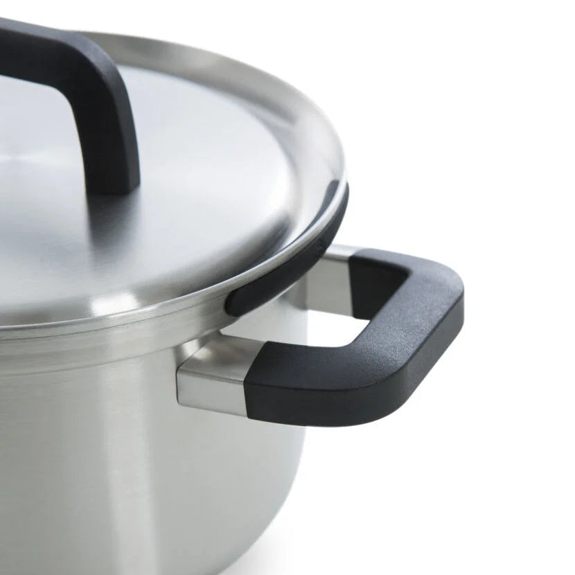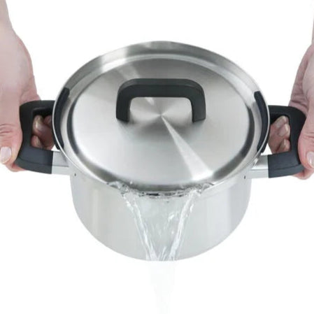 Vergroot het kookgemak in de keuken met BK Flow Cool. Deze gebruiksvriendelijke pannenserie is voorzien van een veilig en uniek afgietsysteem. Met een simpele kwartslag draai, vergrendel je het deksel onder de zwarte siliconen stoppers. Zo kun je op een veilige manier met twee handen afgieten. De steelpan kun je zelfs met een hand afgieten! De pannen zijn voorzien van stevige hooggeplaatste koudgrepen welke niet snel warm worden. Deze pannen zijn gemaakt van hoogwaardig edelstaal en hebben een ingekapselde sandwichbodem. Zo warmen ze sneller op en wordt de warmte perfect en gelijkmatig verdeeld. De Flow serie is op elke warmtebron te gebruiken (incl. inductie). Na gebruik kunnen de pannen gereinigd worden in de vaatwasser. Daarnaast zijn ze goed stapelbaar vanwege de hooggeplaatste grepen; zo bespaar je ruimte in de keukenkast.