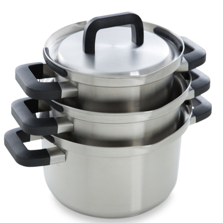 Deze pannenserie is zo ontworpen dat de verschillende pannen gemakkelijk in elkaar passen. Hierdoor zijn de pannen ruimtebesparend te stapelen zonder ze te beschadigen.