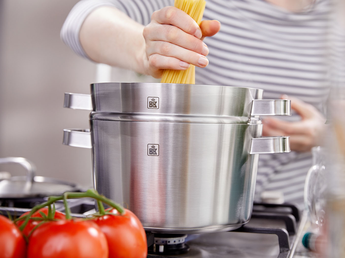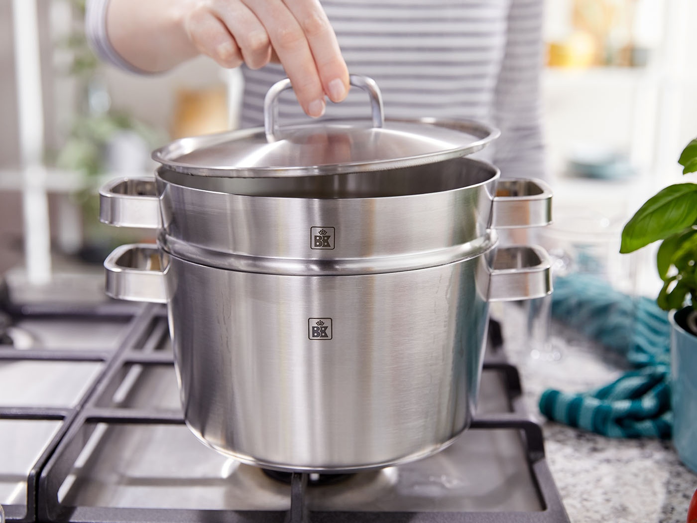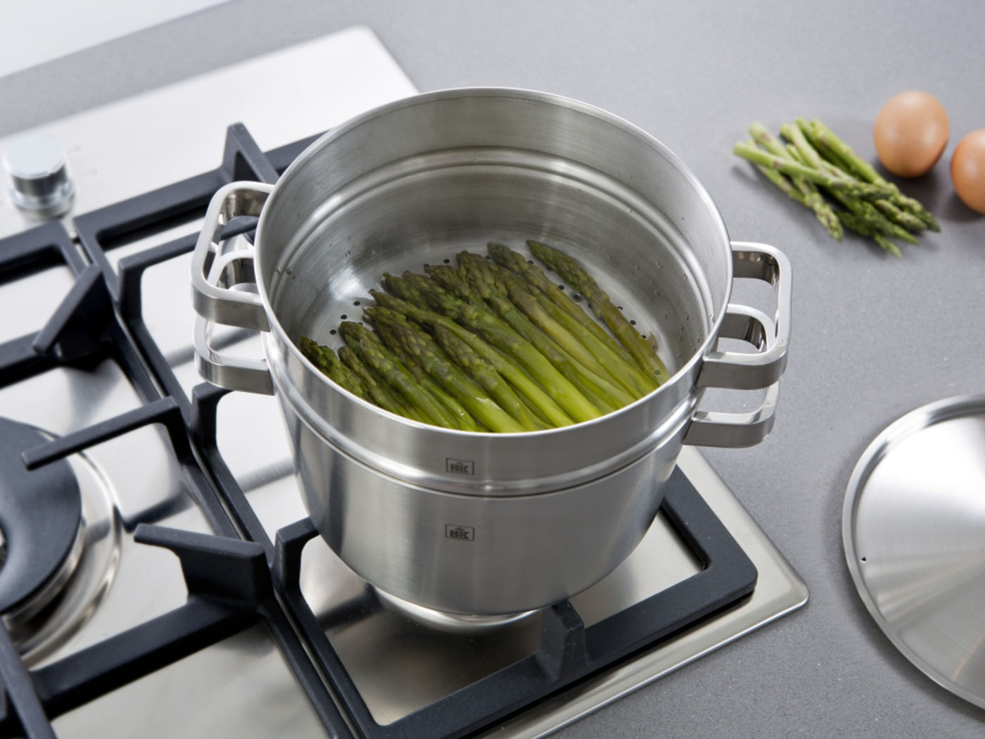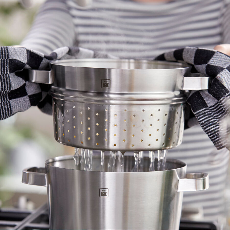 BK heeft in zijn assortiment de BK Conical+ 2-delige tomerinzet. Deze twee inzetbare stoompannen kan je plaatsen op elke 20 cm kookpan uit de BK Conical serie. Ze passen precies in de kookpan en zien er ongeveer hetzelfde uit, maar hebben een dunnere, geperforeerde bodem. Hierdoor kan de stoom van het kokende water uit de waterpan de ingrediënten in de stoompannen bereiken. Doordat er met deze 2-delige stomerinzet op twee niveaus tegelijk kan worden gestoomd, kun je voor vier personen aardappelen of rijst en tegelijk ook de groenten in één