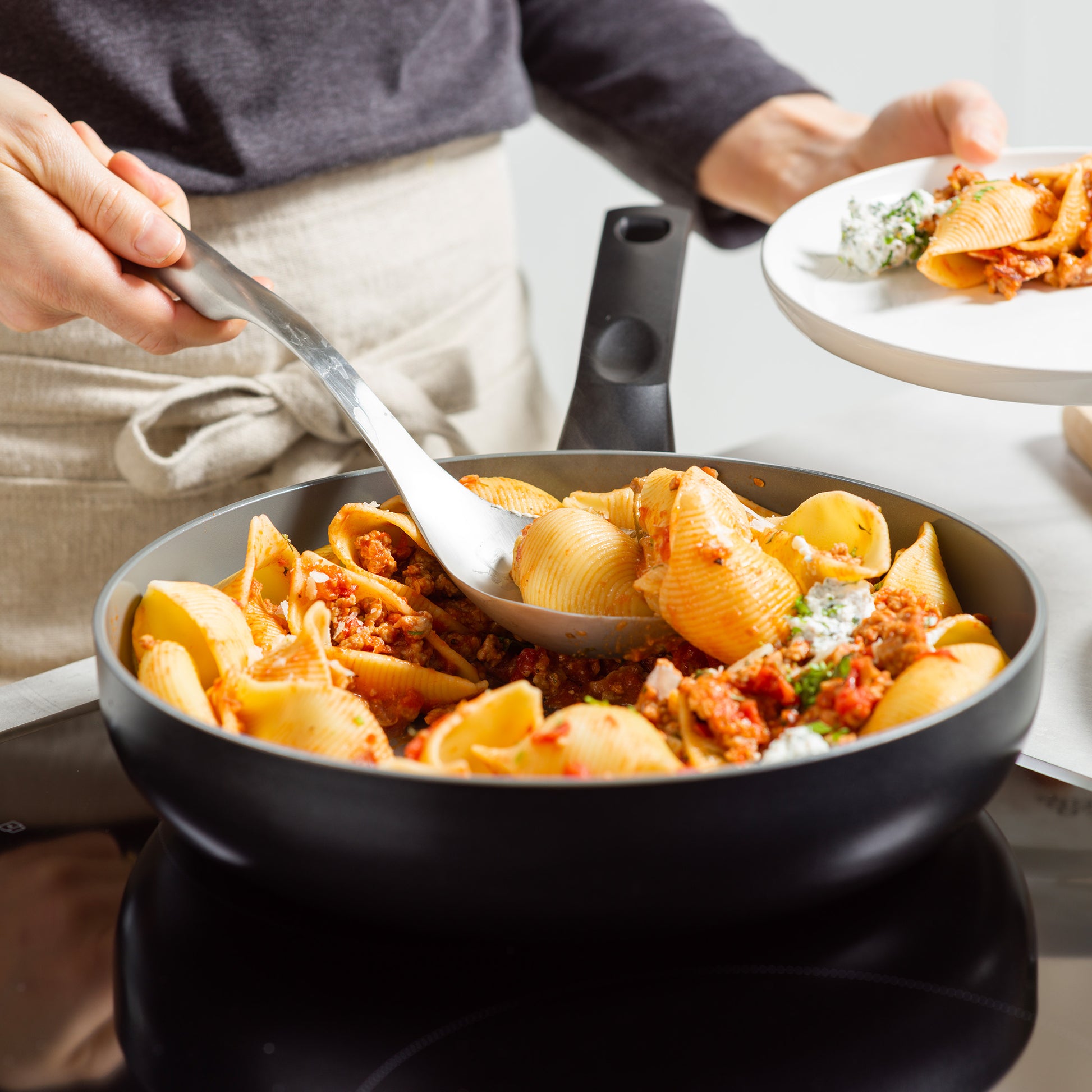 De stevige koudgrepen zijn mooi én functioneel: fraai gevormd, worden niet snel heet, ergonomisch en daardoor veilig in gebruik. De pannen zijn geschikt voor alle warmtebronnen, inclusief inductie en de oven (tot 160°C).