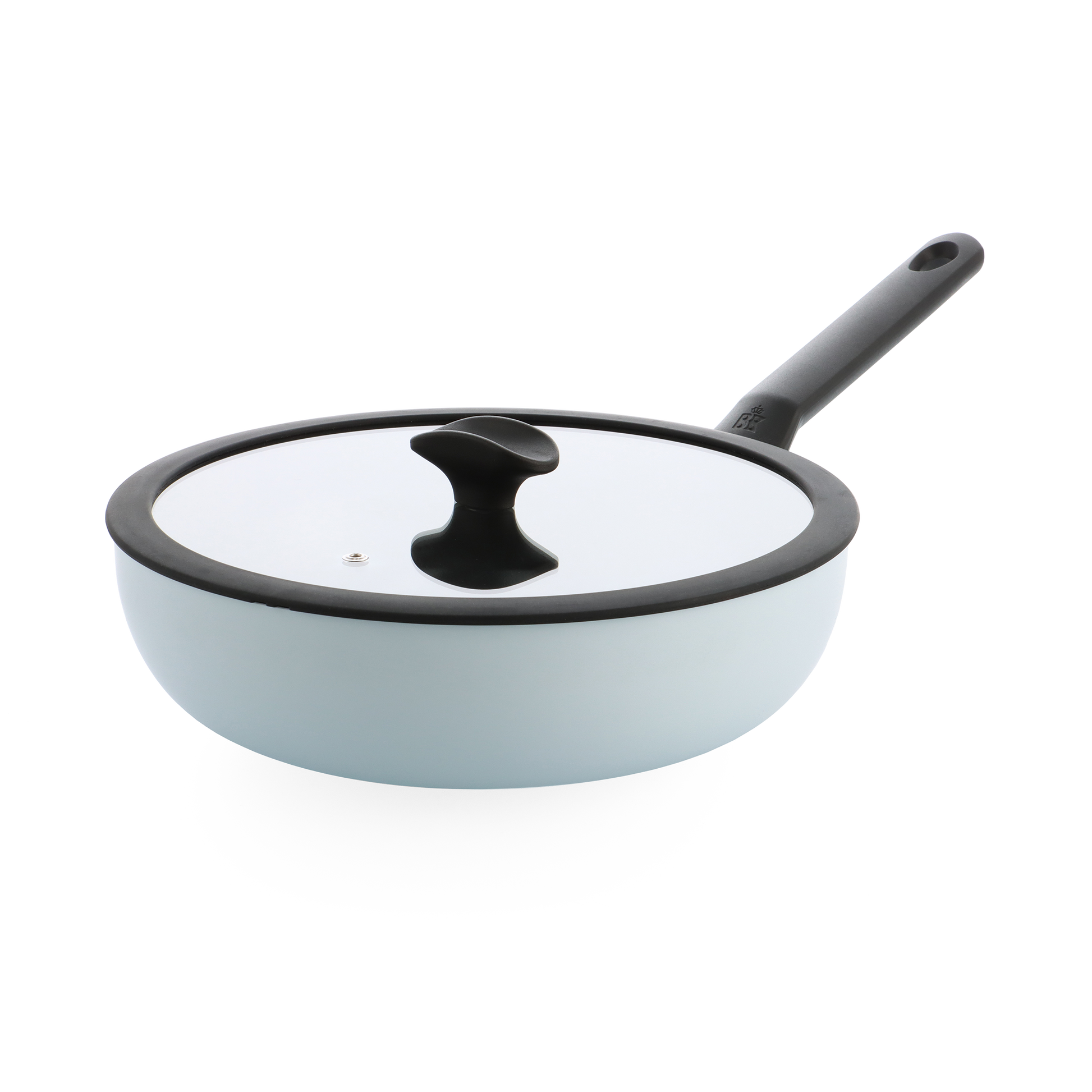 De pannen uit deze serie zijn gemaakt van stevig aluminium en hebben een PFAS-vrije keramische antiaanbaklaag. Koelblijvende grepen en glazen deksels met een isolerende siliconen rand zorgen voor extra gebruiksgemak.