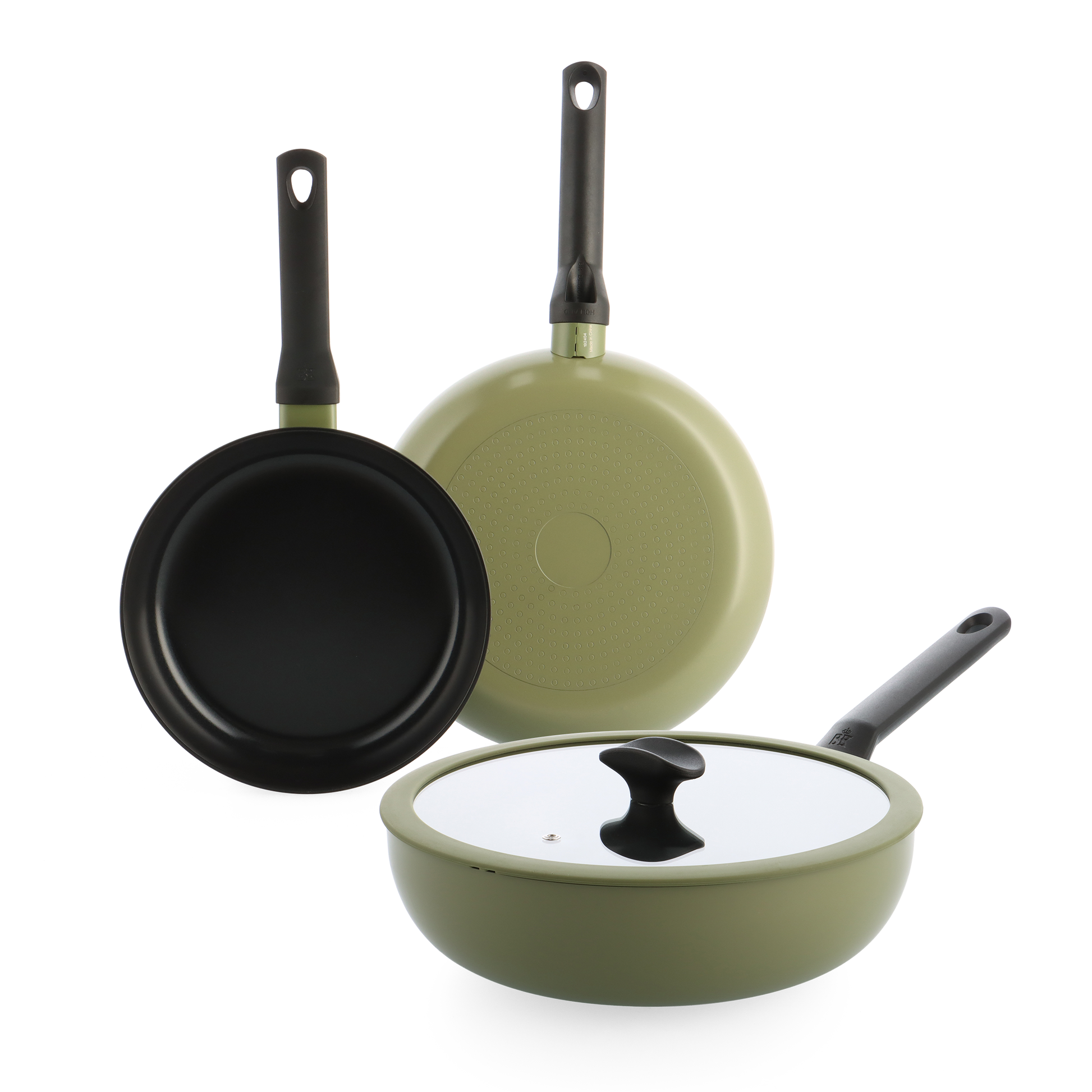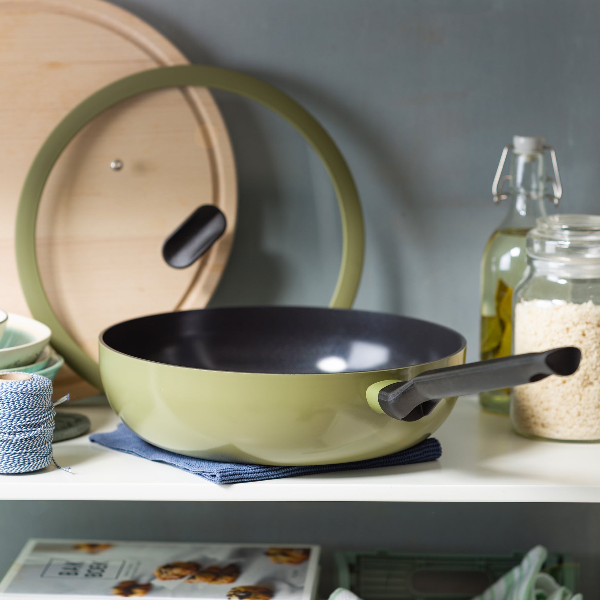 De pannen uit deze serie zijn gemaakt van stevig aluminium en hebben een PFAS-vrije keramische antiaanbaklaag. Koelblijvende grepen en glazen deksels met een isolerende siliconen rand zorgen voor extra gebruiksgemak.