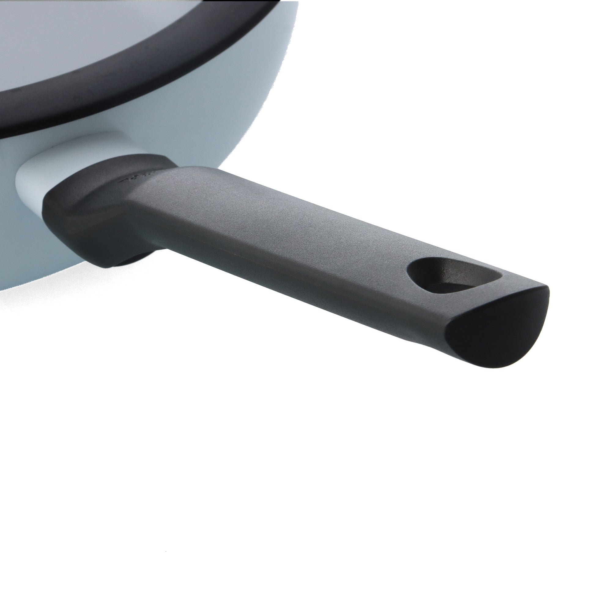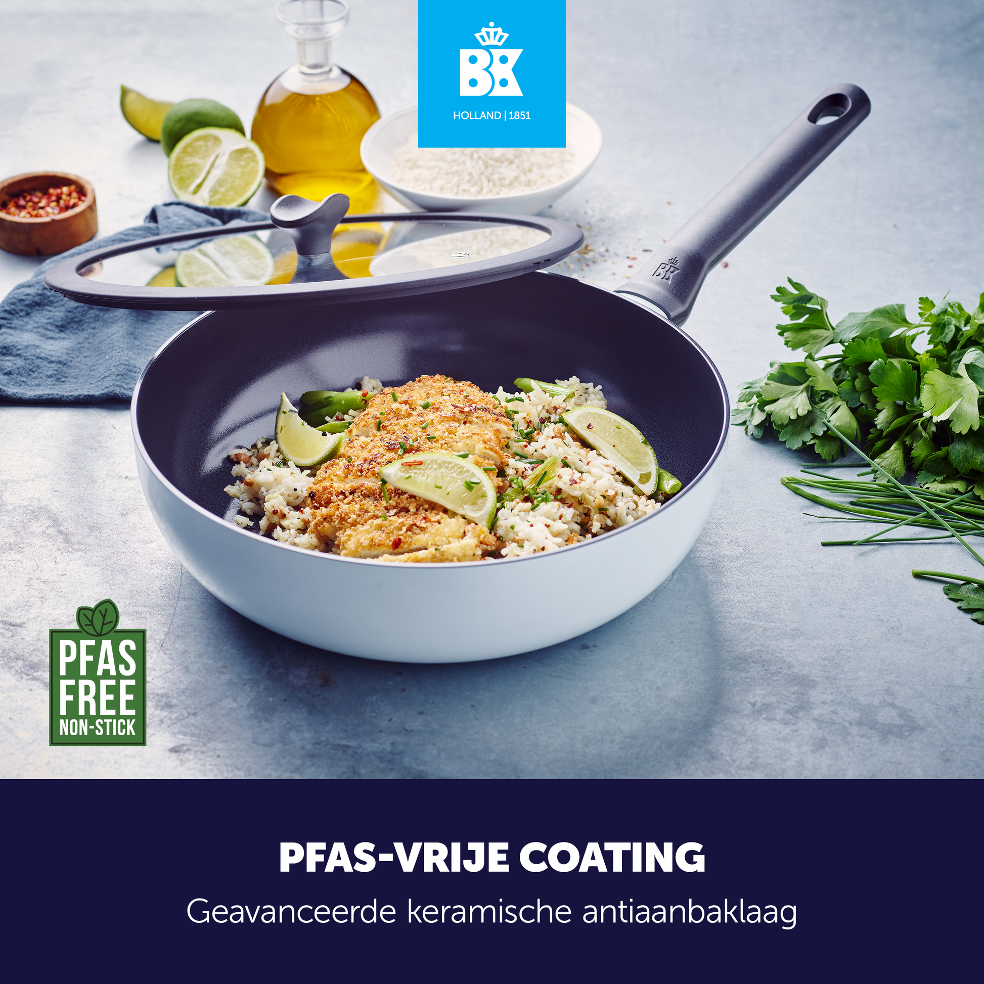 De pannen uit deze serie zijn gemaakt van stevig aluminium en hebben een PFAS-vrije keramische antiaanbaklaag. Koelblijvende grepen en glazen deksels met een isolerende siliconen rand zorgen voor extra gebruiksgemak.
