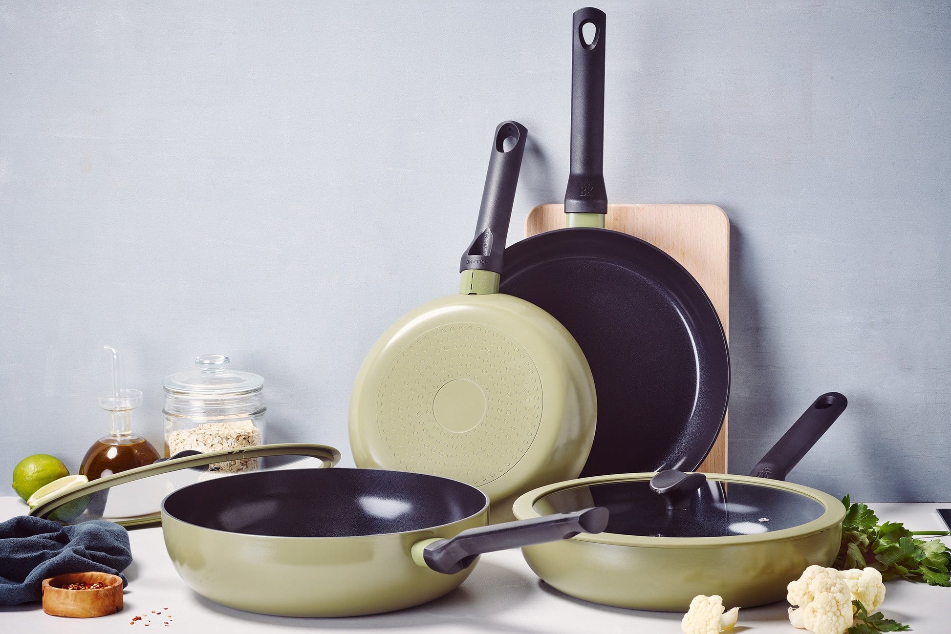 De pannen uit deze serie zijn gemaakt van stevig aluminium en hebben een PFAS-vrije keramische antiaanbaklaag. Koelblijvende grepen en glazen deksels met een isolerende siliconen rand zorgen voor extra gebruiksgemak.