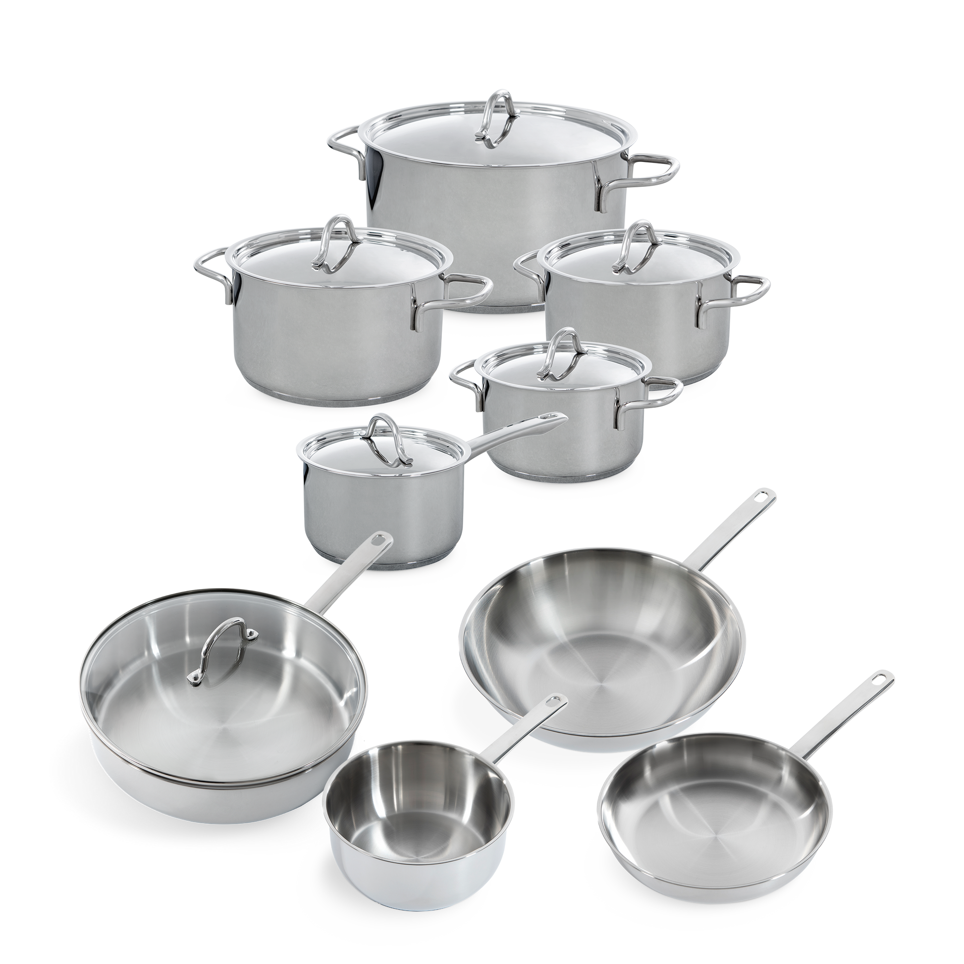 Deze tijdloze set in roestvrij edelstaal is een aanwinst voor elke keuken. Koken, bakken, braden, stoven, wokken … Deze topper kan elk gerecht en elke kooktechniek aan! De pannen zijn niet alleen mooi met hun body van hoogglans gepolijst roestvrij edelstaal. Ze zijn ook oersterk, zodat je er jarenlang plezier van hebt. Dankzij hun sandwichbodem warmen de pannen sneller en gelijkmatiger op. Zo geniet je keer op keer van geslaagde kook- en bakresultaten op elk fornuis, ook inductie. Na gebruik kunnen de pannen de vaatwasser in. Lekker makkelijk!