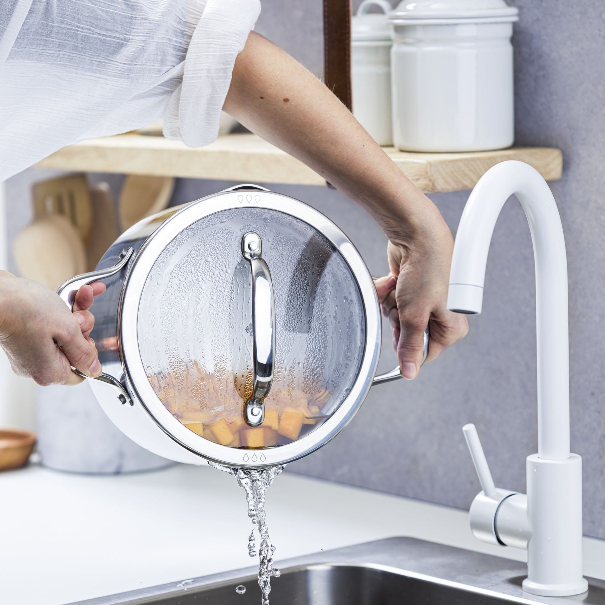 Deze pannen zijn vervaardigd uit roestvrij staal en beschikken over een uniek afgietsysteem: je vergrendelt de deksel in één handomdraai in de rand van de pan, waardoor je veilig kunt afgieten.