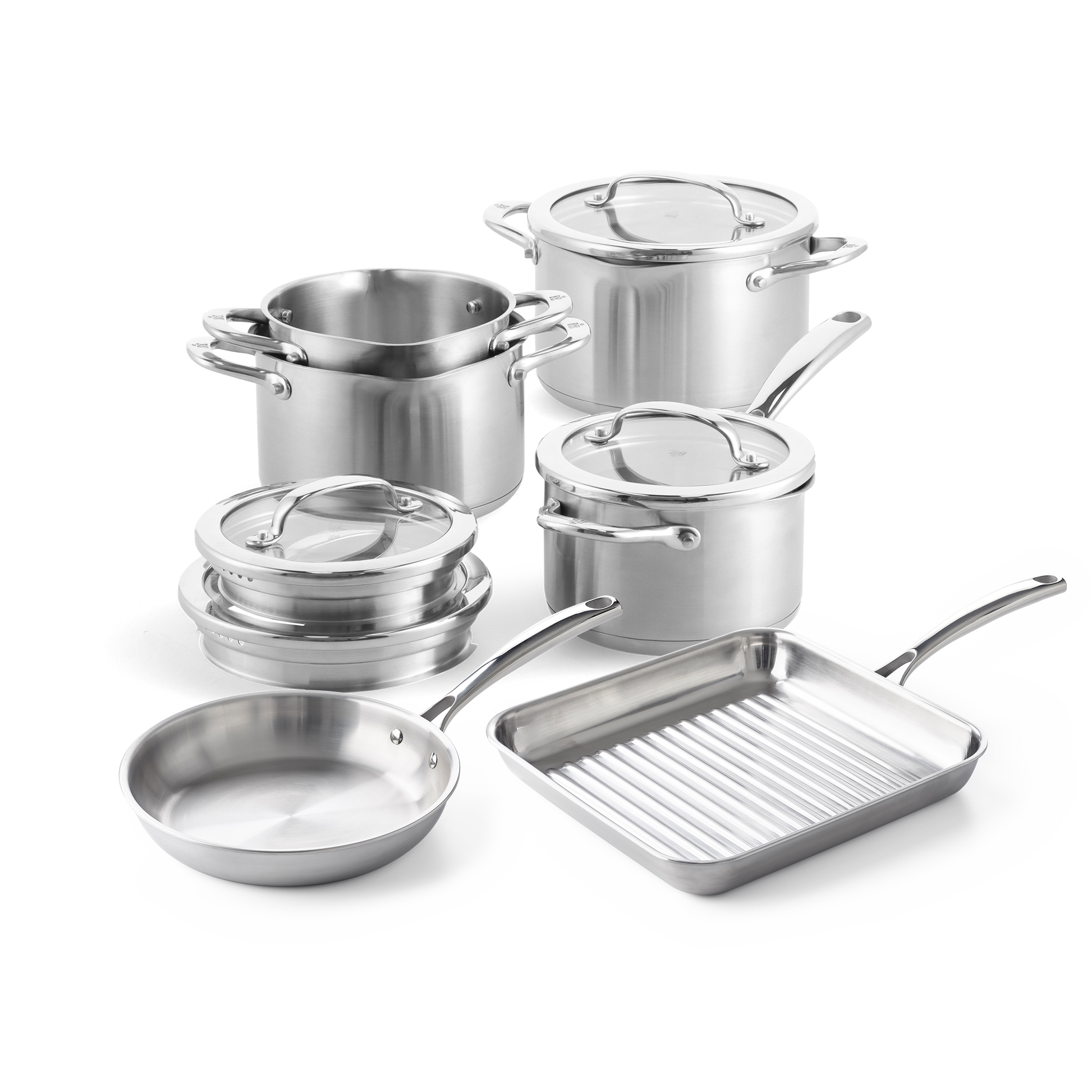 Met deze mooie set wordt koken een feestje! Alle pannen zijn gemaakt van oersterk roestvrij staal. De koekenpan en grillpan hebben zelfs een 3-ply body, een unieke constructie van twee lagen roestvrij edelstaal met een laag aluminium ertussen. Die zorgt voor een snelle en uitstekende warmteverdeling zonder hotspots. Ideaal om te bakken en grillen op hoge temperaturen! De kookpannen en steelpan hebben dan weer een handig afgietsysteem en een stapelbaar design, waardoor je ze compact kunt opbergen. Kwaliteit, gebruiksgemak en knap design in één? Check!